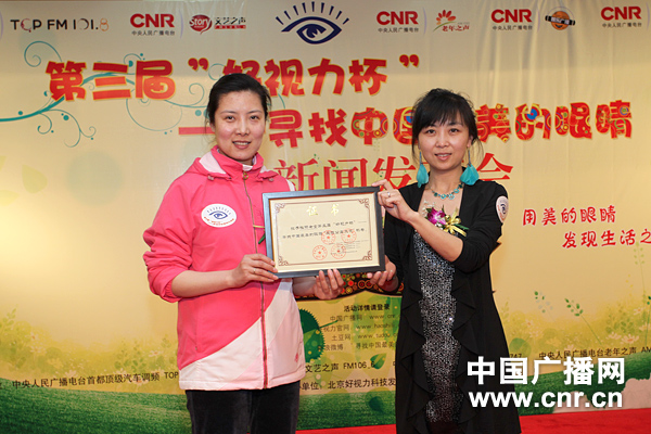 央廣都市文化傳媒有限公司總經(jīng)理孟昕(右)為杜麗頒發(fā)“愛(ài)眼公益大使”證書(shū) 中廣網(wǎng)記者涂傲 攝