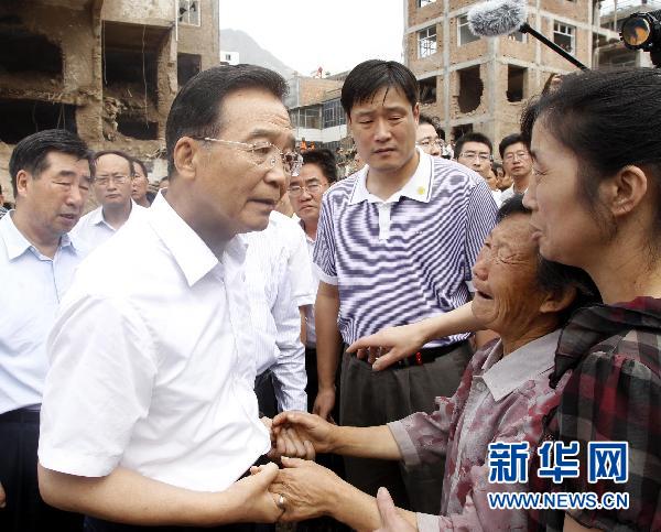 8月9日,中共中央政治局常委、國務(wù)院總理溫家寶繼續在甘肅舟曲縣特大山洪泥石流災區察看災情,指導抗洪搶險救災工作。這是溫家寶在舟曲縣災區撫慰失去親人的群眾。新華社記者 李學(xué)仁 攝