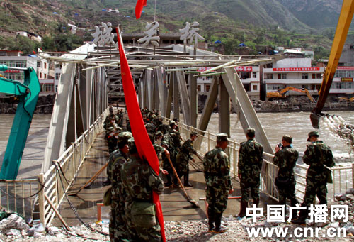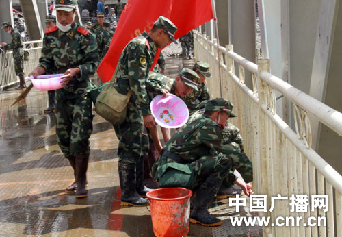 據武警甘肅總隊政治部副主任張進(jìn)文介紹,城關(guān)橋是連接舟曲縣南北兩岸的重要通道,在泥石流災害發(fā)生后就一直被淹沒(méi)在江水中。隨著(zhù)水面降低,橋面部分被淤泥掩蓋,為此,武警甘肅總隊甘南支隊的百余名官兵采取人工作業(yè),徒手將橋面的淤泥全部清除。
