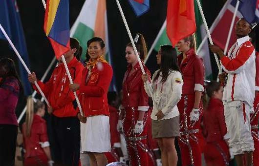 8月12日,第30屆夏季奧林匹克運動(dòng)會(huì )閉幕式在倫敦奧林匹克體育場(chǎng)舉行。這是中國代表團旗手、奧運會(huì )女子激光雷迪爾級冠軍徐莉佳(右三)在閉幕式上高舉五星紅旗入場(chǎng)。這是中國代表團旗手、奧運會(huì )女子激光雷迪爾級冠軍徐莉佳(中)在閉幕式上手舉五星紅旗入場(chǎng)。