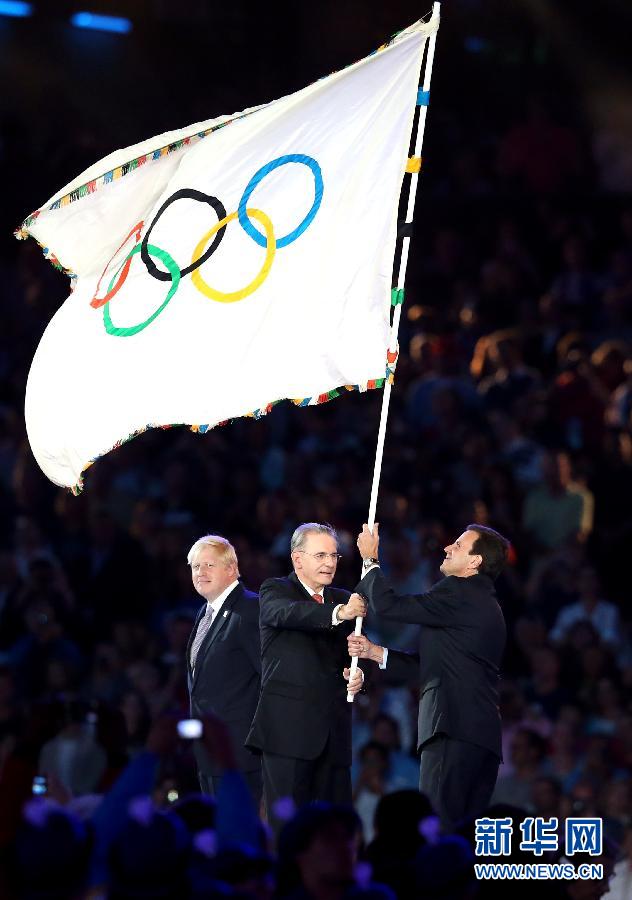8月12日,第30屆夏季奧林匹克運動(dòng)會(huì )閉幕式在倫敦奧林匹克體育場(chǎng)舉行。這是閉幕式上,國際奧委會(huì )主席羅格(中)將奧林匹克會(huì )旗交給下屆夏季奧林匹克運動(dòng)會(huì )舉辦地巴西里約熱內盧市市長(cháng)愛(ài)德華多·帕伊(右)。新華社記者凡軍攝