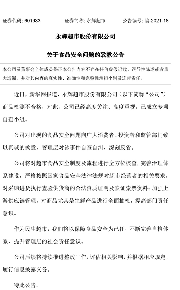 央廣網(wǎng)福州4月16日消息 4月16日,永輝超市發(fā)布關(guān)于食品安全問(wèn)題的致歉公告:公司對出現的食品安全問(wèn)題向廣大消費者、投資者和監管部門(mén)致以真誠的歉意,管理層對該事件自查自糾,深刻反省。公司將對超市食品安全制度及流程進(jìn)行全方位核查,完善治理體系建設。