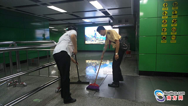 據南方網(wǎng)報道,7月17日下午,廣州地鐵3號線(xiàn)客村站站臺內發(fā)生漏水。據現場(chǎng)目擊者江女士稱(chēng),漏水點(diǎn)位于該站3號線(xiàn)與8號線(xiàn)夾層間的一間房屋,水從房間門(mén)縫流出后,經(jīng)天花板落至3號線(xiàn)候車(chē)月臺,乘客乘車(chē)受到影響!败(chē)站里好像下雨一樣!苯糠Q(chēng)。目前,臨近流水點(diǎn)的扶梯已經(jīng)停運,漏水原因仍在調查中。