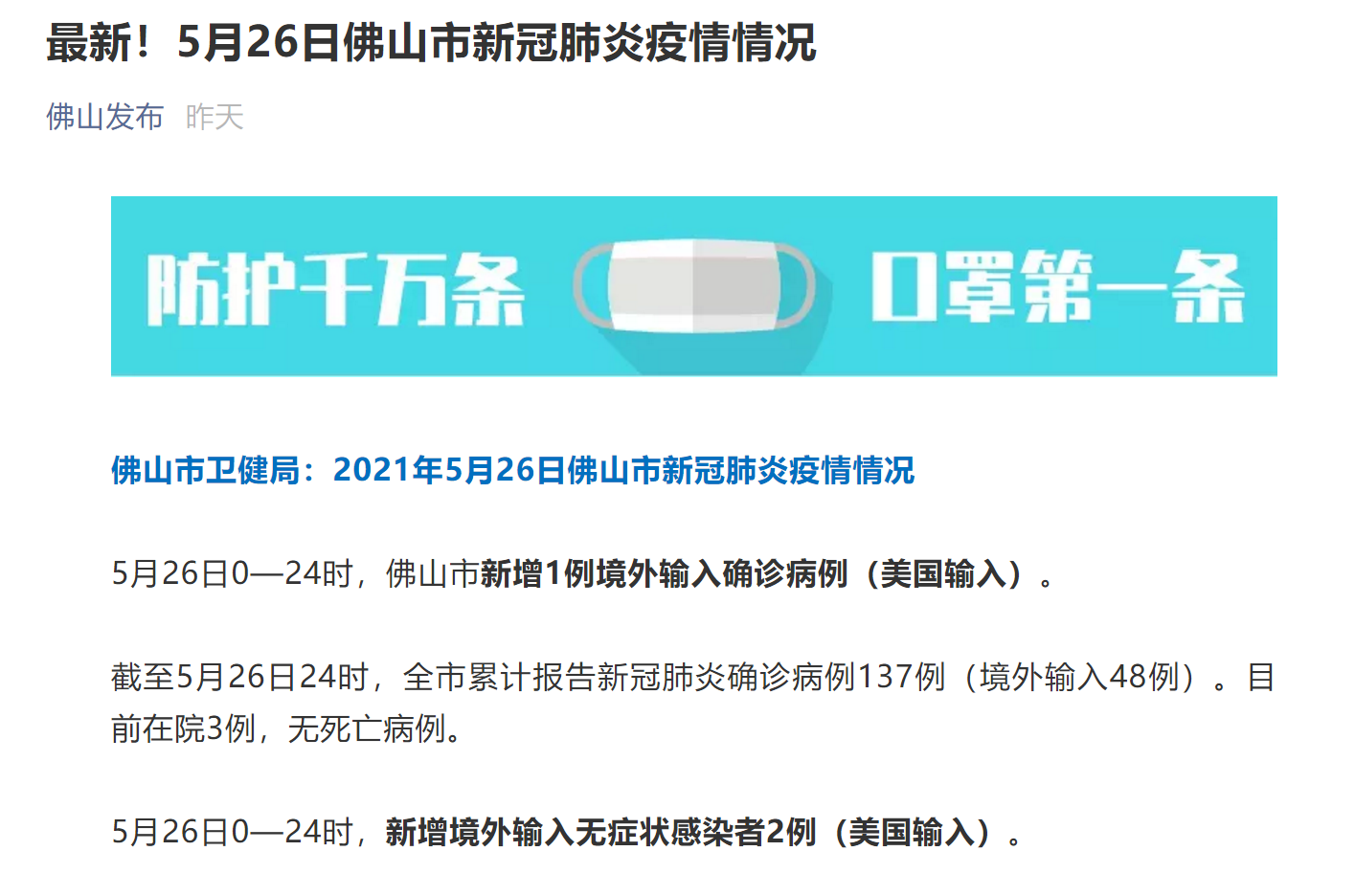 央廣網(wǎng)佛山5月28日消息(記者 夏燕 佛山電臺 陳仲華、陸佩蘭)5月26日佛山市新增1例境外輸入確診病例(美國輸入)。消息發(fā)布當天下午,佛山市南海區發(fā)布開(kāi)展大規模人員核酸檢測的通告,并連夜開(kāi)展核酸檢測。