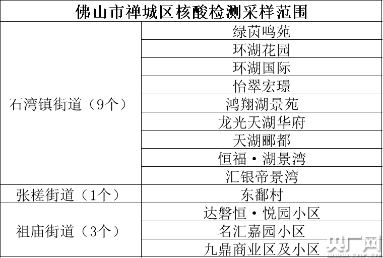 佛山市禪城區核酸檢測采樣范圍(央廣網(wǎng)記者 夏燕 制表)