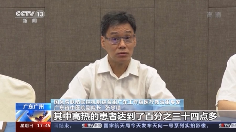 國務(wù)院聯(lián)防聯(lián)控機制綜合組廣東工作組醫療救治組專(zhuān)家、廣東省中醫院副院長(cháng) 張忠德:本輪廣州疫情中高熱、發(fā)燒的病人特別多,我們統計了一下,166個(gè)病人之中,發(fā)熱的病人達到了百分之八十多,其中高熱的患者達到了百分之三十四點(diǎn)多,所以就對我們的治療帶來(lái)了挑戰。我們還發(fā)現患者從普通型向重癥轉變的時(shí)間很短,以前我們在其他地方看了可能是7天,可能9天,有些是第10天,這里有些第3、4、5天就轉變過(guò)去了,所以治療上就要求我們采取的措施要更果斷。
