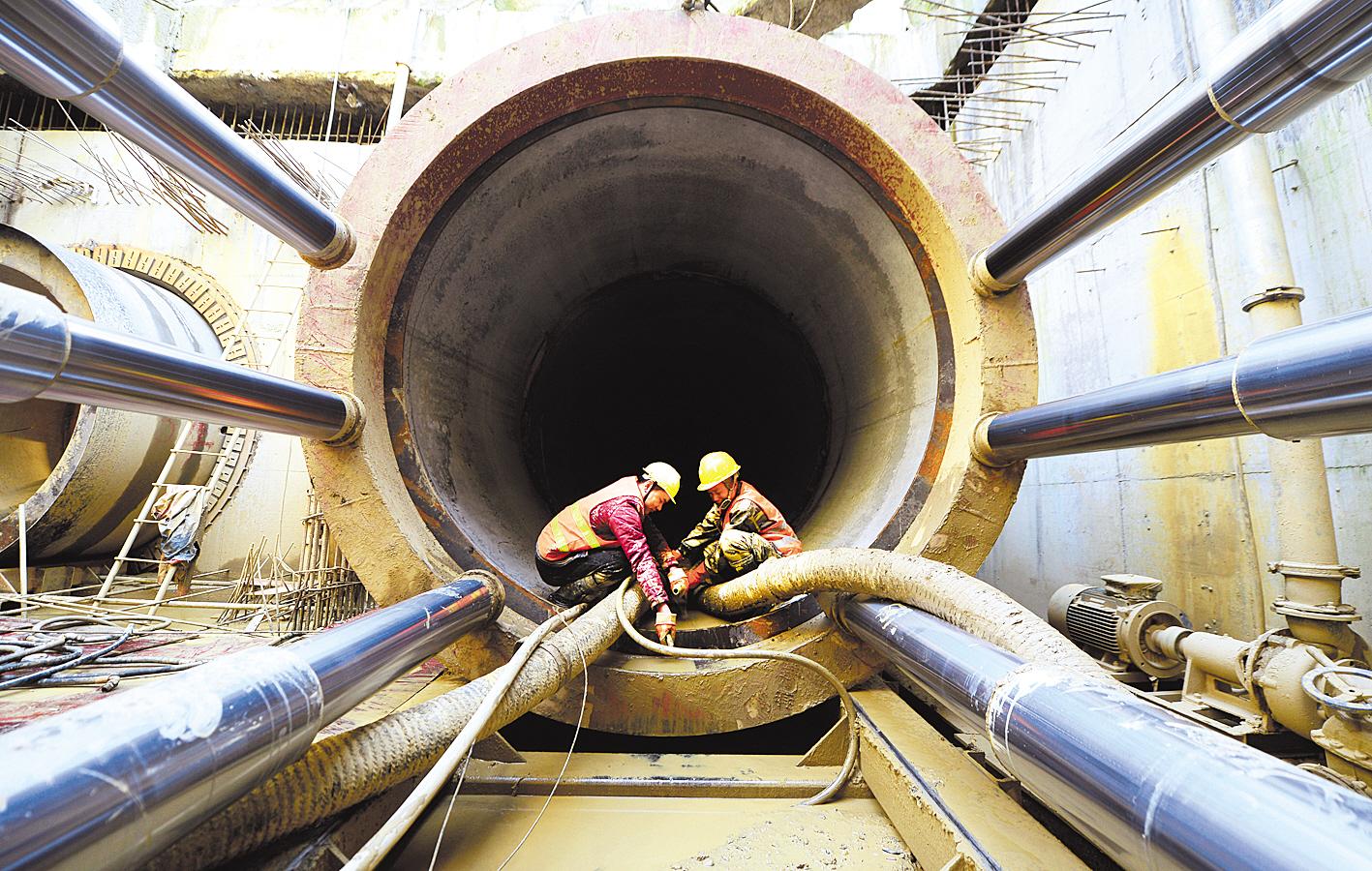 3月4日,襄陽(yáng)市樊西綜合管廊一期工程施工現場(chǎng),工人在做管道頂進(jìn)完成后的收尾工作。
