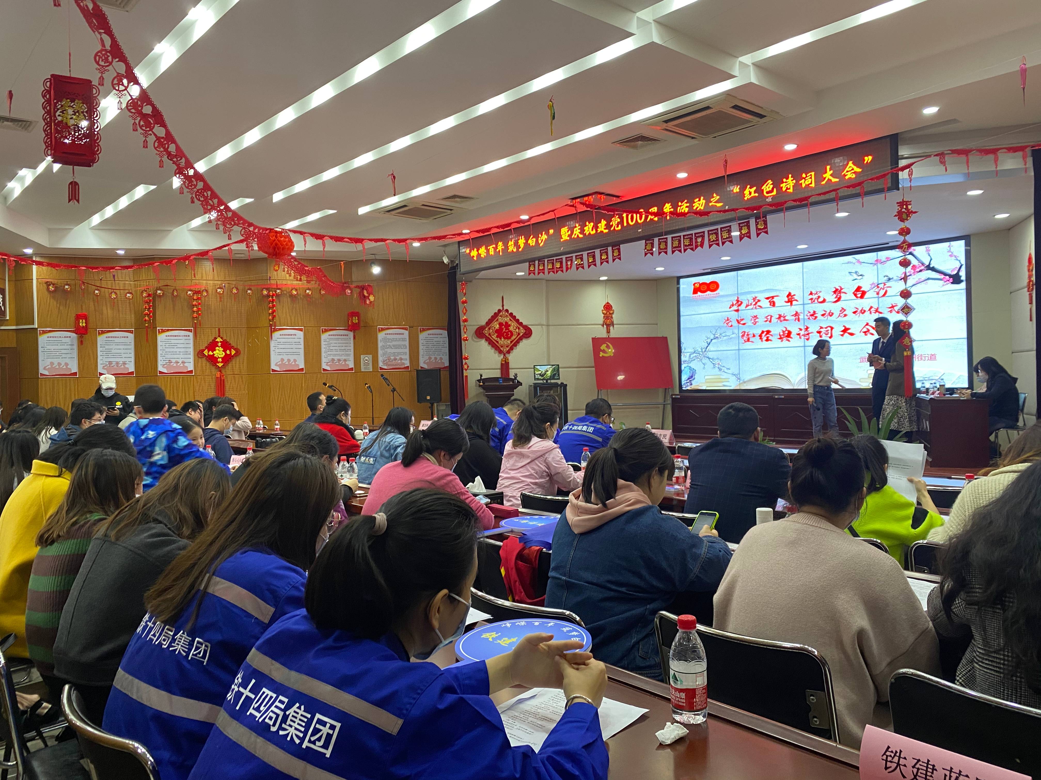 隨著(zhù)赤紅流沙的緩緩灑落,“崢嶸百年 筑夢(mèng)白沙”八個(gè)醒目的大字映入眼簾,詩(shī)詞大會(huì )正式開(kāi)始。詩(shī)詞大會(huì )比賽分為“說(shuō)上句接下句”“點(diǎn)字成詩(shī)”“看圖猜詩(shī)”3個(gè)環(huán)節,以紅色詩(shī)詞為主,團隊作戰,采取積分淘汰制,答對題數多的隊伍獲勝晉級下一環(huán)節;顒(dòng)中,17支參賽隊伍依次上臺亮像,童心向黨隊“恰同學(xué)少年,乘長(cháng)風(fēng)破浪!”、兩新組織群英隊“強強聯(lián)合 以詩(shī)會(huì )友”、八鋪街社區牽夢(mèng)詩(shī)華隊“詩(shī)潤中華心,詞頌中國夢(mèng)!”、中鐵十四局鐵建藍隊“不畏艱險 勇攀高峰”等參賽口號響徹會(huì )場(chǎng),展示了參賽隊員們志在必得的信心,臺下助威應援聲此起彼伏,將現場(chǎng)氣氛推向高潮。