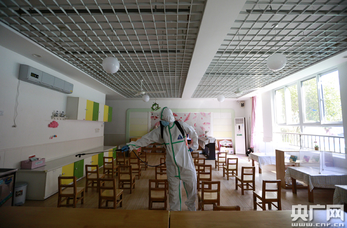 圖為:2020年8月28日,在湖北省武漢市華中師范大學(xué)附屬鐵橋幼兒園內,消防員正在對班級教室進(jìn)行全面消殺。(央廣網(wǎng)發(fā) 通訊員王方攝)