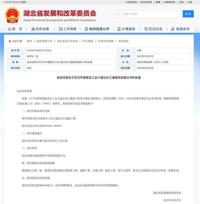 據介紹,該項目將建設跨江大橋一座,建設內容包括跨江段橋梁工程、道路工程、交通工程、排水工程、電氣工程等,跨長(cháng)江正橋部分全長(cháng)約3780米,橋寬42米。項目單位為武漢市城市建設投資開(kāi)發(fā)集團有限公司,項目估算總投資46.88億元,擬采用PPP模式,由武漢市政府和相關(guān)單位共同籌資。