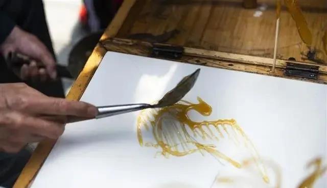 糖畫(huà)匠人正在用糖漿畫(huà)糖畫(huà)。