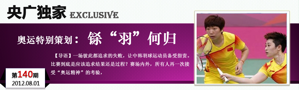 * 中國羽毛球頭號女雙組合“讓球”敗給韓國 現場(chǎng)遭噓 在31日的倫敦奧運會(huì )羽毛球女雙小組賽A組最后一場(chǎng)比賽中,世界排名第一的中國組合于洋/王曉理以14:21和11:21爆冷不敵韓國組合鄭景銀/金荷娜,由于雙方在場(chǎng)上失誤頻頻,擊球不是出界就是下網(wǎng),比賽時(shí)溫布利體育館內噓聲四起,F場(chǎng)的觀(guān)眾則很不理解:“雙方在國際水平以下,簡(jiǎn)直是訓練的水平,這對其他選手是不公平的。中國是體育大國,應該給其他隊伍做個(gè)榜樣,在賽場(chǎng)上應該代表中國的形象! |