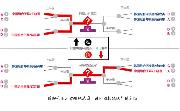 * 韓國隊總教練成漢國:中國隊是始作俑者 由于C組的河貞恩/金旼貞與波莉/喬哈里的比賽在A(yíng)組那場(chǎng)比賽結束之后進(jìn)行,所以這兩對組合可以選擇比賽結果,進(jìn)而選擇四分之一決賽的對手。雙方在比賽中都不想獲勝,因為勝者將面對世界第一的于洋/王曉理,勝面不大。