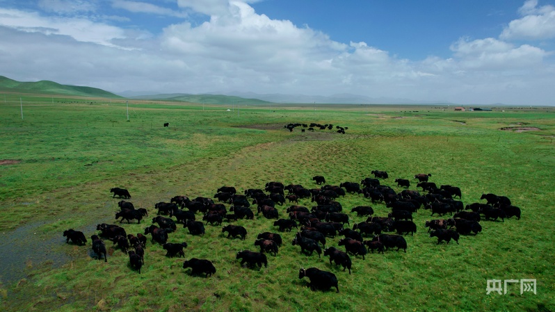 初秋的青海省黃南藏族自治州河南蒙古族自治縣,成群牦牛悠閑覓食,潔白蒙古包點(diǎn)綴其間。