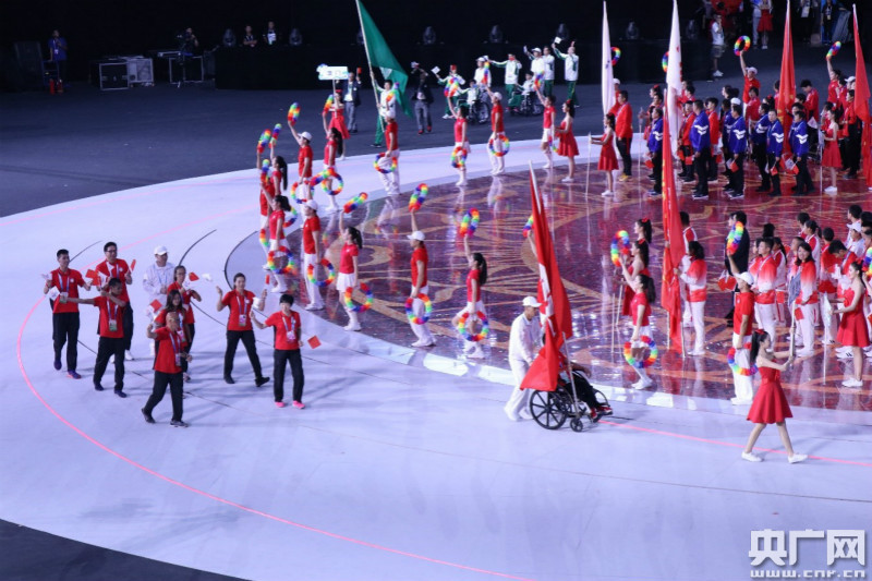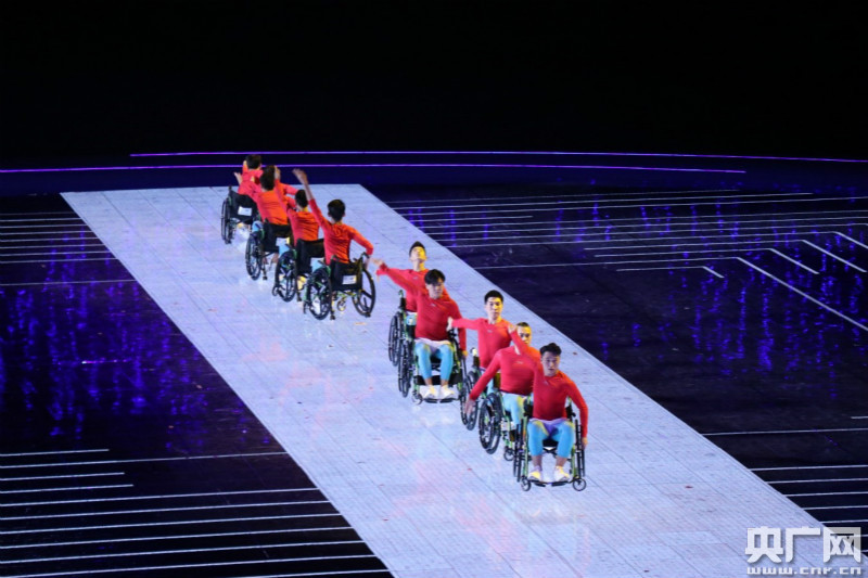 開(kāi)幕式于當晚20時(shí)正式開(kāi)始。在護旗手的護衛下,中華人民共和國國旗、殘運會(huì )會(huì )旗、特奧會(huì )會(huì )旗分別入場(chǎng)。隨后裁判員代表方隊和35個(gè)代表團的殘疾人運動(dòng)員代表依次入場(chǎng)。