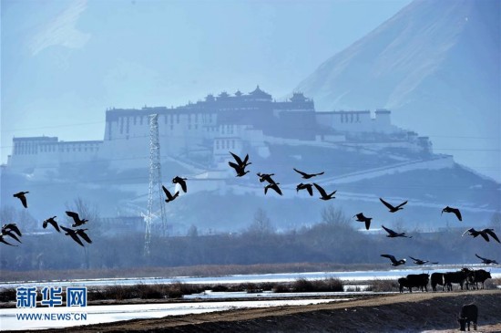 水鳥(niǎo)飛翔在拉魯濕地上空(1月7日攝)。入冬以來(lái),位于拉薩城邊的拉魯濕地國家級自然保護區候鳥(niǎo)增多,斑頭雁、赤麻鴨、野鴨等數十種候鳥(niǎo)在這里過(guò)冬。拉魯濕地國家級自然保護區海拔3600多米,總面積12.64平方公里,是中國海拔最高、面積最大的城市天然濕地,被譽(yù)為“拉薩之肺”。新華社記者 張汝鋒 攝