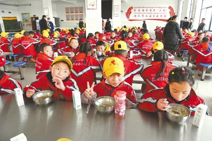 圖為那曲市聶榮縣第二完全小學(xué)的孩子們在學(xué)校吃晚飯。本報記者 李洲 攝