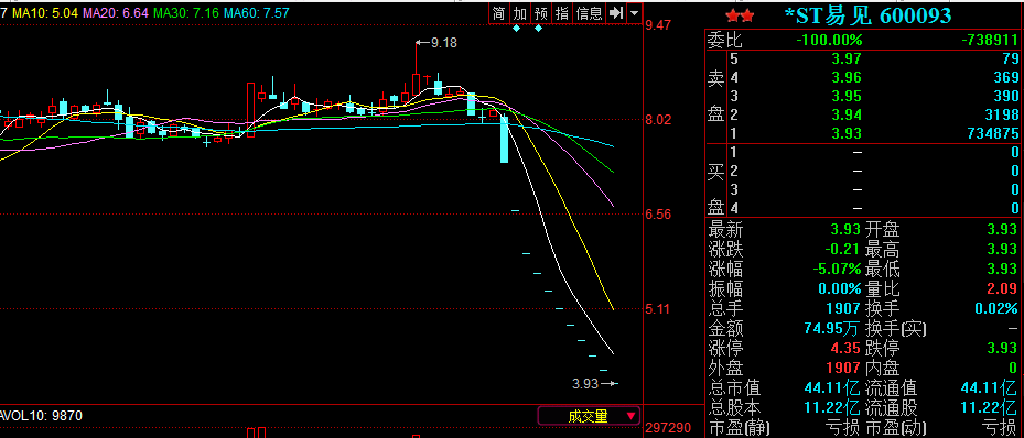 央廣網(wǎng)昆明7月17日消息(記者馬智波)7月16日,*ST易見(jiàn)(曾用名:易見(jiàn)股份)迎來(lái)復牌后第八個(gè)跌停,跌幅為5.07%。易見(jiàn)股份在4月30日停牌,停牌前連續三個(gè)交易日跌停,跌幅10%。從復牌前到現在,已經(jīng)連續11個(gè)跌停,以4月27日收盤(pán)價(jià)8.13計算,其股價(jià)跌幅已經(jīng)達到51.6%。